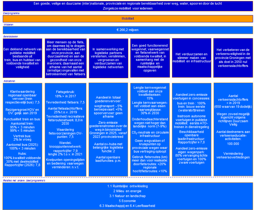 Ons mobiliteitsbeleid heeft tot doel om brede welvaart te bevorderen: wij specificeren brede welvaart in acht maatschappelijke opgaven. Dat betekent dat we een bijdrage leveren om de kwaliteit van leven van mensen nu en in de toekomst te verbeteren. Mobiliteit is daarmee geen doel op zich, het is een middel. Wij leveren een bijdrage aan brede welvaart door zorgeloze mobiliteit te organiseren. Wij werken aan deze zorgeloze mobiliteit aan de hand van zes mobiliteitsthema’s. Dat betekent dat we inzetten op geen emissies, uitstekende bereikbaarheid, toegankelijk voor jong en oud, arm en rijk, mindervalide en valide. Het betekent ook betaalbaar, veilig, comfortabel, makkelijk en gezond reizen met optimale doorstroming van en naar mooie, leefbare gebieden, steden en dorpen. Waarbij mobiliteit de schakel is tussen wonen, werken en vrije tijd. De manier waarop we dat doen, verandert van een knelpuntgerichte aanpak naar een opgavegerichte aanpak.