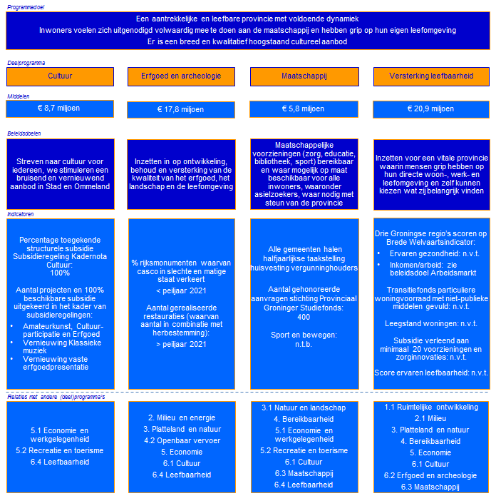 Een aantrekkelijke en leefbare provincie. Inwoners voelen zich uitgenodigd volwaardig mee te doen aan de maatschappij en hebben grip op hun eigen leefomgeving. Het doel is om de brede welvaart in onze provincie te verbeteren. Er is een breed en kwalitatief hoogstaand cultureel aanbod.